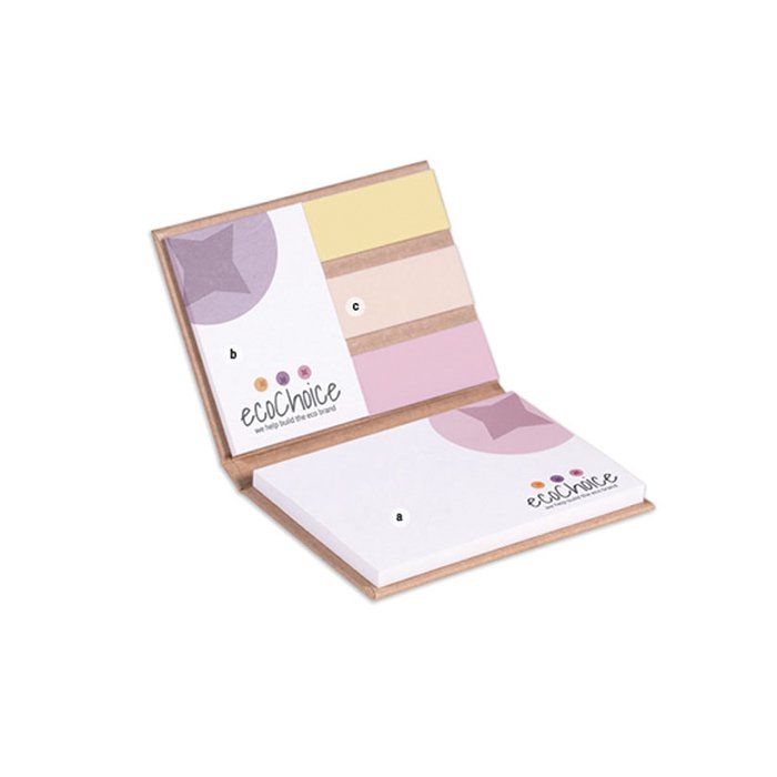 ComboNote de papel reciclado de tapa dura (106x77 mm, cerrado) con notas adhesivas de papel reciclado (80 g) de 100x72 mm y 50x72 mm; y marcadores reciclados de 3 colores diferentes. El precio incluye impresión a todo color (CMYK*) de las notas adhesivas y la parte exterior de la tapa. Cada artículo se empaqueta en una bolsa de polipropileno individual.