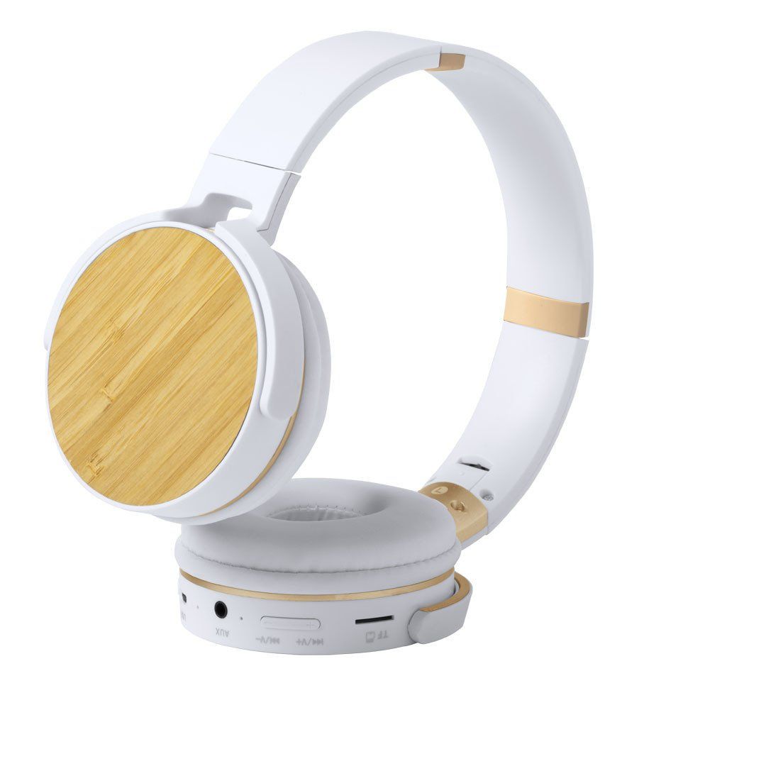 Auriculares de línea nature. Diseño plegable de diadema, con conexión Bluetooth® 5.0 y detalles en bambú procedente de cortes naturales. Con ranura para tarjeta micro SD -tarjeta no incluida-, función manos libres, radio FM, entrada de línea -cable mini jack de 3,5mm incluido- y recargables mediante cable micro USB -incluido-. Con cómodas almohadillas en polipiel de color blanco y presentados en atractiva caja de diseño eco.