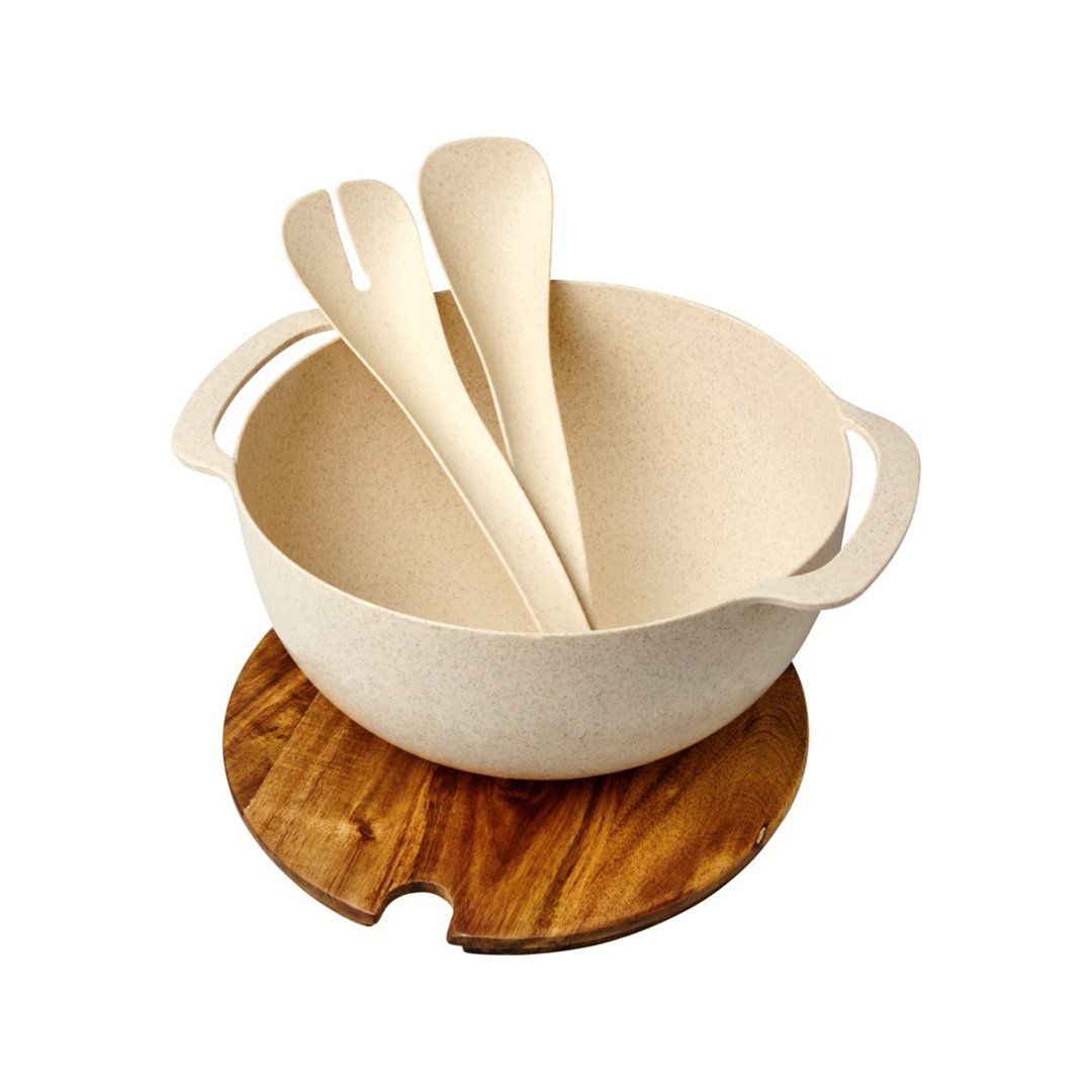 Ensaladera de fibra de trigo con servicio “Lucha”. Ensaladera con utensilios para servir compuestos por un 50 % de fibra de paja de trigo y un 50 % de plástico PP. Incluye una tapa de madera de acacia que también se puede utilizar como tabla de cortar.