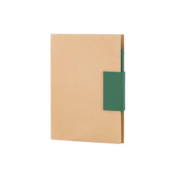 Libreta A5 fabricada en cartón y cierre de solapa en diferentes colores. En su interior dispone de: Bolígrafo, una libreta con 50 hojas de color blanco, un bloc con 20 notas adhesivas de color blanco, un bloc con 20 notas adhesivas de color amarillo y 100 marcapáginas de colores.